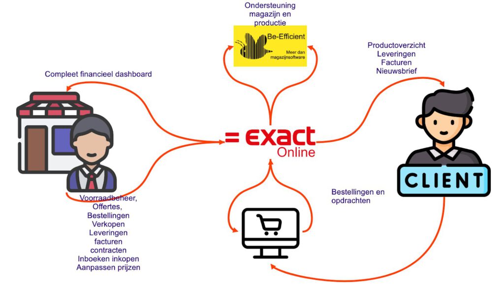 Rondom Exact Online kun je verschillende programma’s aanschaffen die het werken met een ERP systeem vereenvoudigen en verder stroomlijnen. Dit is waar Be-Efficient jou van dienst kan zijn. Met Be-Efficient hoef je geen papieren picklijsten te maken en wordt alle communicatie direct in het ERP opgeslagen. De bestellingen uit de webshop en de voorraden zijn in het ERP beschikbaar. Hier komen picklijsten uit. Deze lijsten worden gecheckt en naar het magazijn gestuurd. In het magazijn werken jullie met de Be-Efficient applicatie op de scanners. Alle picklijsten zijn hier te zien. En alles wat gepickt wordt, wordt direct doorgecomuniceerd naar het ERP systeem.