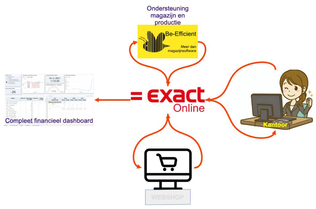 Het aantal rode lijntjes is significant verminderd nu je met een ERP één punt van waarheid hebt gecreëerd voor je bedrijf. Alles wordt hierin opgeslagen, alle communicatie loopt via het ERP en de webshop & voorraad zijn volledig geïntegreerd. Een bekend systeem is Exact Online (https://www.exact.com/nl/producten/erp).