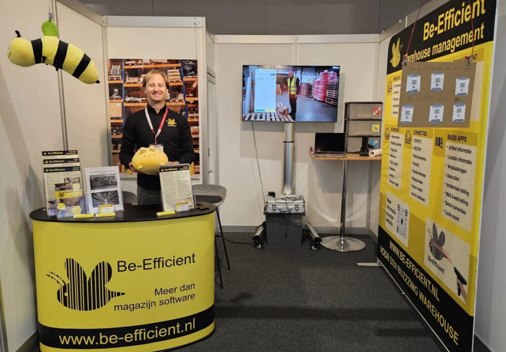 Het Be-Efficient WMS is het afgelopen jaar uitgegroeid tot een volwaardig systeem dat we op de beurs met trots presenteren aan collega-bedrijven en klanten. Om onze software te laten zien, hebben we achterin de stand een klein magazijn ingericht met artikelen die gescand en verplaatst kunnen worden. We maken een praatje met de mensen die langs komen lopen in de hoop dat ze blijven plakken voor een demo in ons magazijntje. En dat ze daarna ook onze WMS in gebruik willen gaan nemen!